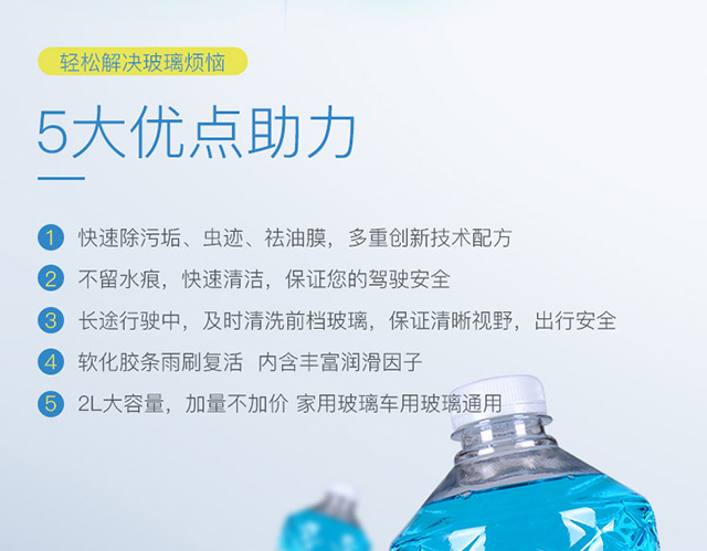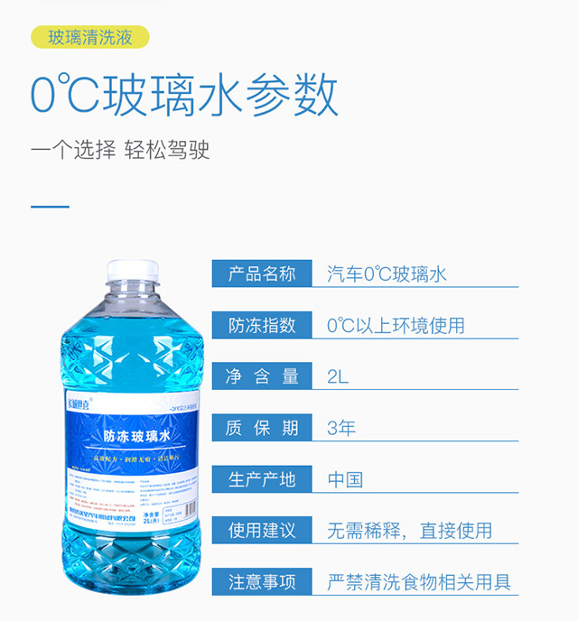 防冻指数:0°C 至-5°C;适用环境:汽车清洁;产品产地:国产;保质期:3年;产品规格:1L至2L;包装规格:多瓶装;产品形态:非浓缩;产品品牌:长城世喜;产品型号:0度;包装清单:长城世喜0℃/2L玻璃水*2;