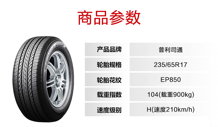 花纹性能:节能环保型;车型类别:SUV轮胎;胎面宽度:235;扁平比:65;尺寸:17英寸;轮胎特性:其他;产品品牌:普利司通(Bridgestone);包装清单:普利司通(Bridgestone)235/65R17 EP850 104H × 1;