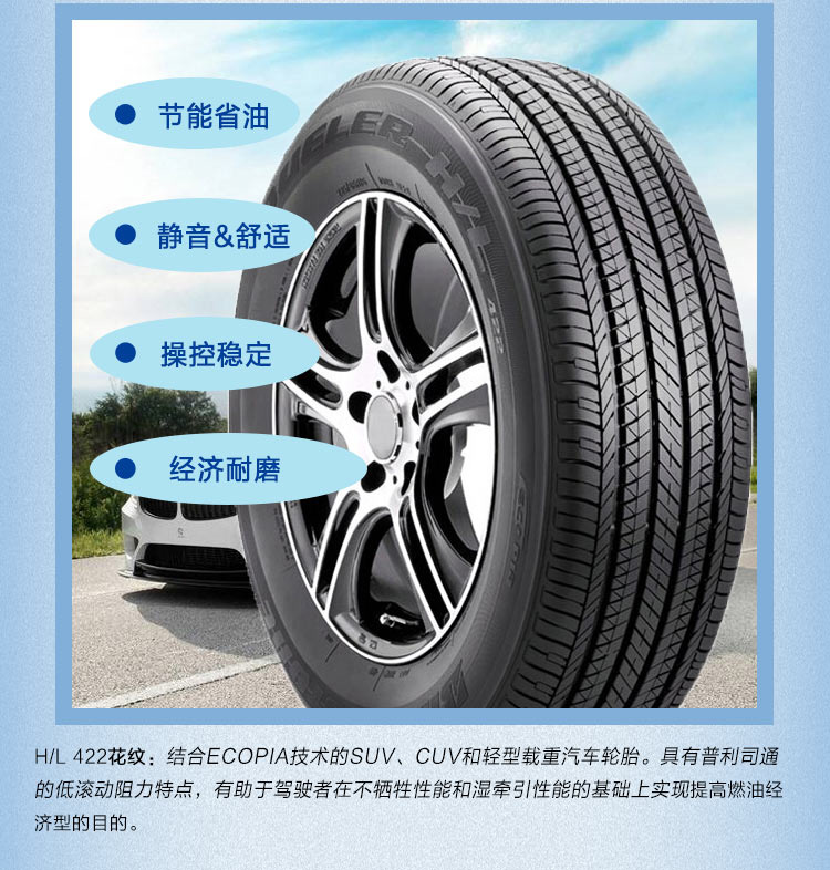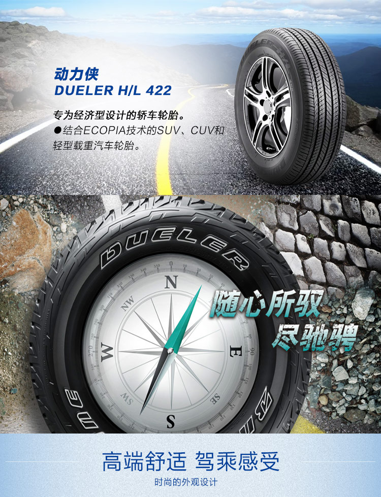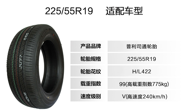 花纹性能:运动操控型;车型类别:轿车轮胎;胎面宽度:225;扁平比:55;尺寸:19英寸;轮胎特性:其他;产品品牌:普利司通(Bridgestone);包装清单:普利司通轮胎 225/55R19 H/L422 99V × 1条;