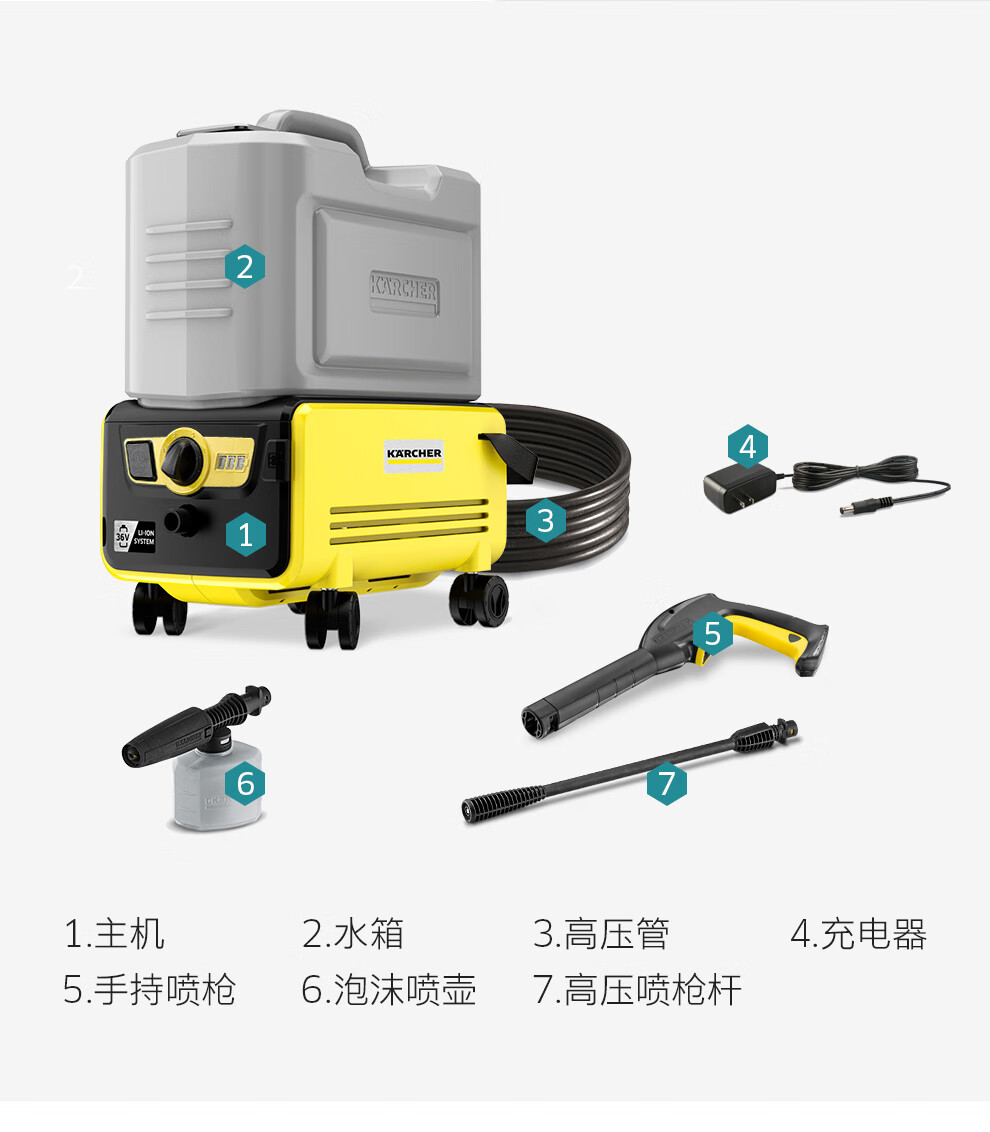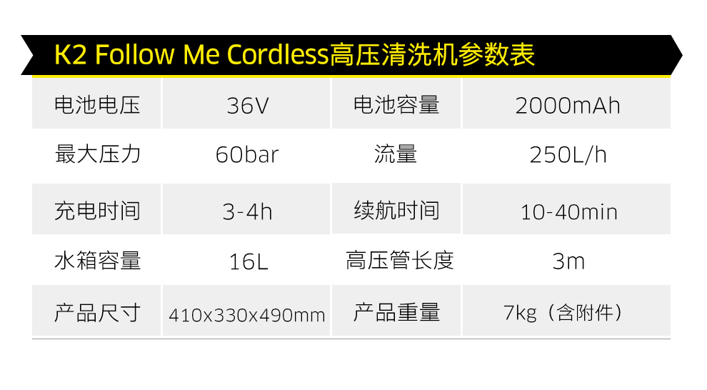 水源类型:自带水箱;电机冷却:风冷;适用环境:市政,生鲜,宠物,园艺,庭院,自行车,牧场,物业,工厂,酒店,摩托车,电动车,汽车;用途类型:家用高压;电源类型:锂电池;外观类型:立式;额定压力:0~70bar;水管长度:10m以下;电机类型:串激电机;产品品牌:KARCHER;产品型号:K2 FOLLOW ME(硬质水箱锂电池版);包装清单:主机x1,16L水箱x1,3m高压管x1,充电器x1,手持喷枪x1,0.3L泡沫喷壶x1,高压喷枪杆x1;