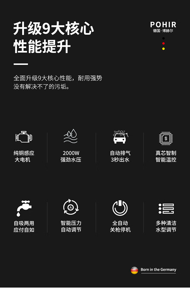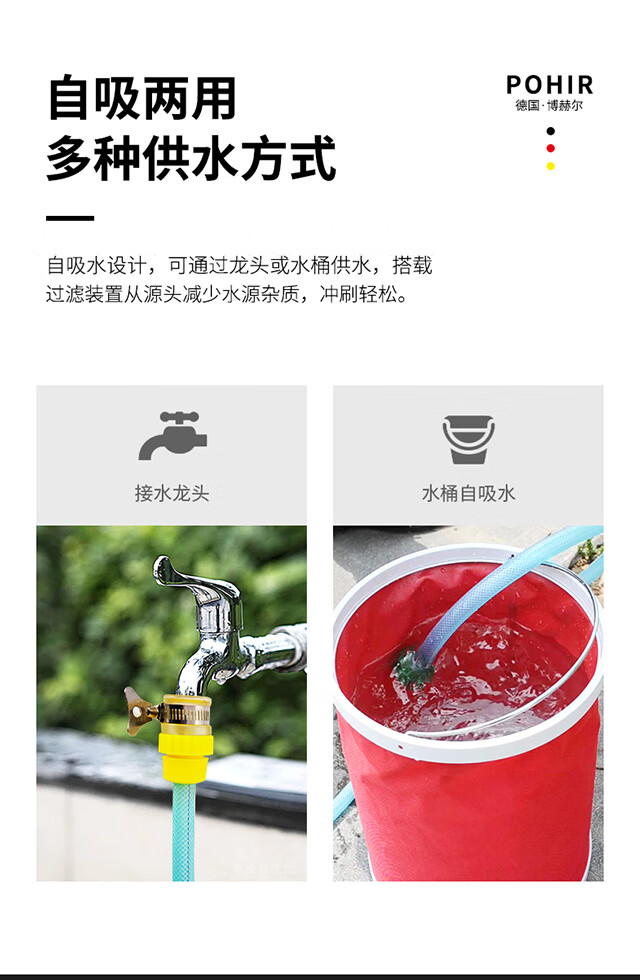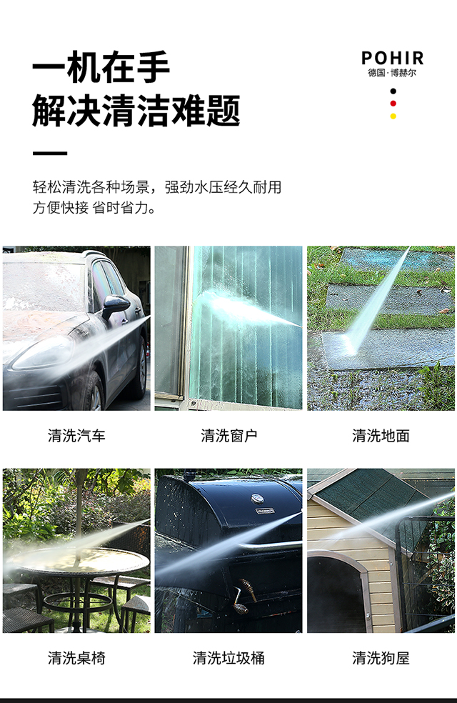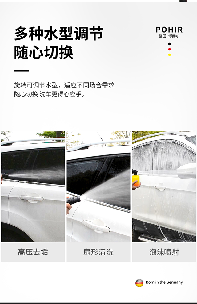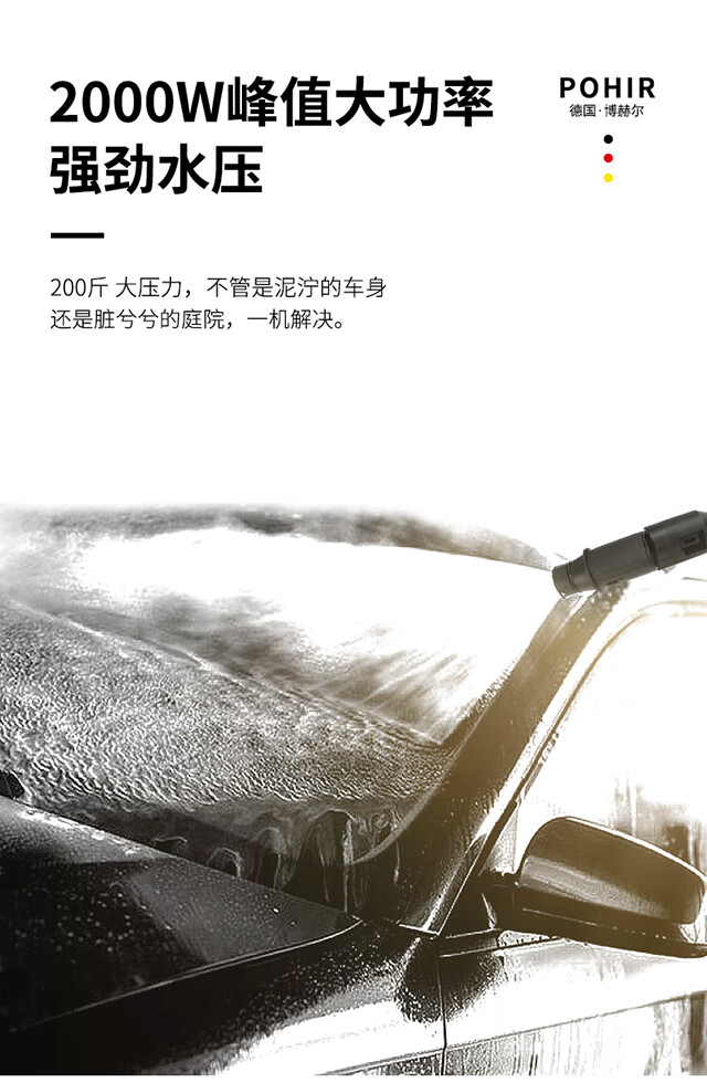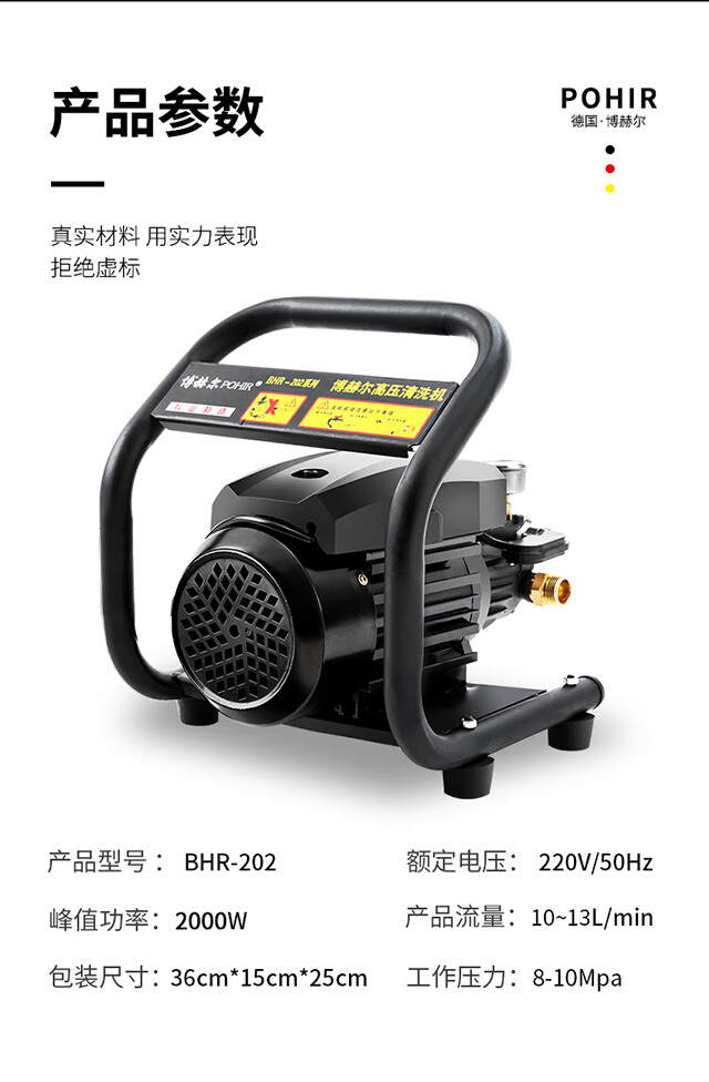 水源类型:自吸,水龙头;电机冷却:风冷;适用环境:汽车,摩托车,电动车,自行车,庭院,园艺,宠物,酒店,物业,生鲜,市政;用途类型:家用高压;电源类型:220V;外观类型:卧式;额定压力:71~110bar;水管长度:10~20m;电机类型:感应电机;产品品牌:博赫尔;产品型号:BHR-202;包装清单:洗车机*1,进水管*1,15米防爆管*1,水枪*1,快插接头*2,水龙头接头*1,进水过滤螺母*1,泡沫壶*1,说明书*1.;
