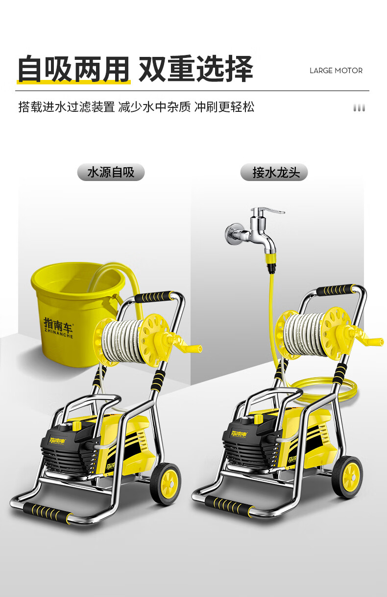 水源类型:自吸,水龙头;电机冷却:风冷;适用环境:汽车,摩托车,电动车,自行车,庭院,园艺,宠物,酒店,工厂,物业,牧场,生鲜,市政;用途类型:商用高压;电源类型:220V;外观类型:推车式;额定压力:111bar以上;水管长度:10~20m;电机类型:感应电机;产品品牌:指南车;产品型号:战狼土豪版带架;包装清单:多功能能短枪 加长杆 15米加粗防爆管 2米进水管 出水铜组件 万能接头 自吸组件 进水快接 漏电保护器 高压泡沫壶 缠绕盘 带架子;