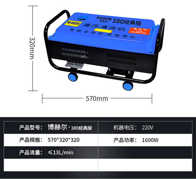 水源类型:自吸,水龙头;电机冷却:风冷;适用环境:汽车,摩托车,电动车,自行车,庭院,园艺,宠物,酒店,物业,生鲜,市政;用途类型:家用高压;电源类型:220V;外观类型:卧式;额定压力:71~110bar;水管长度:10~20m;电机类型:感应电机;产品品牌:博赫尔;产品型号:380;包装清单:主机一台,进水管一根,出水管一根,水枪一把,易损件包一包,说明书一本;