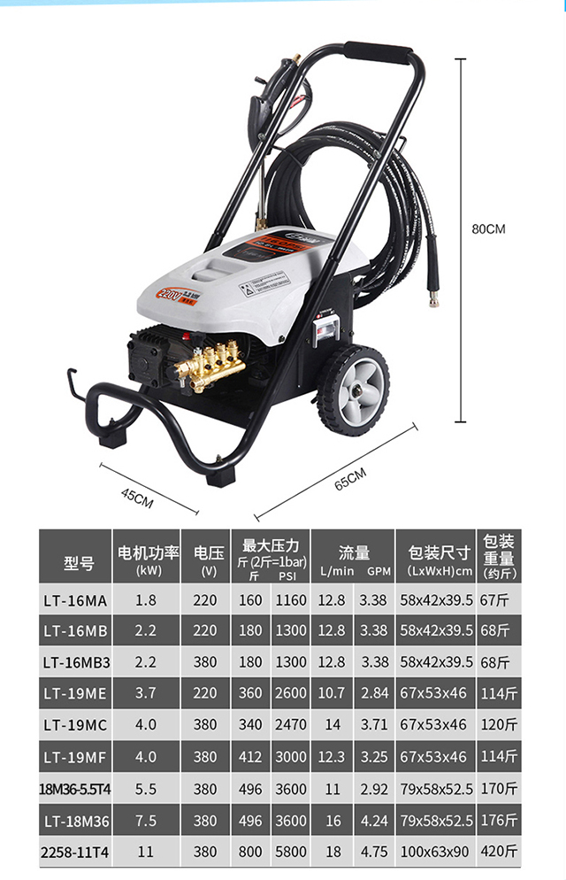 水源类型:自吸;电机冷却:风冷;适用环境:汽车,摩托车,电动车,自行车,庭院,园艺,宠物,酒店,工厂,物业,牧场,生鲜,市政;用途类型:商用高压;电源类型:220V;外观类型:推车式;额定压力:111bar以上;水管长度:10~20m;电机类型:感应电机;产品品牌:绿霸;产品型号:LT-16MB;包装清单:洗车机*1,进水管*1,钢丝管*1,水枪*1,过滤器*1,喷嘴*4,说明书*1;