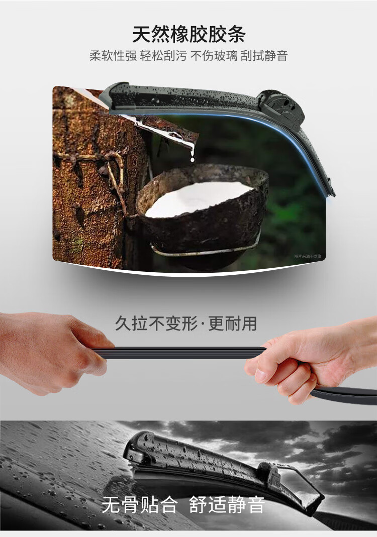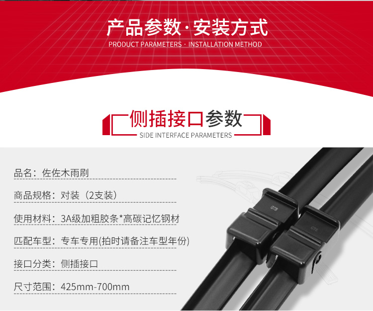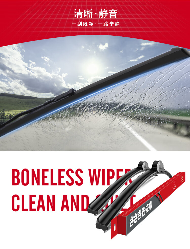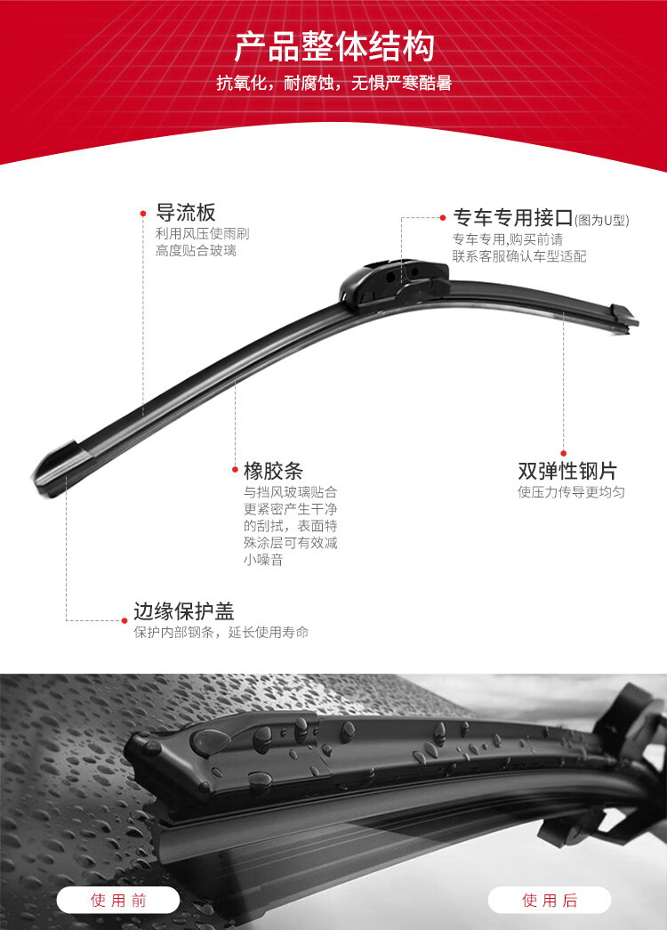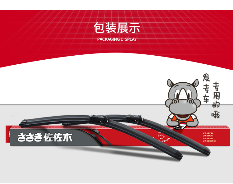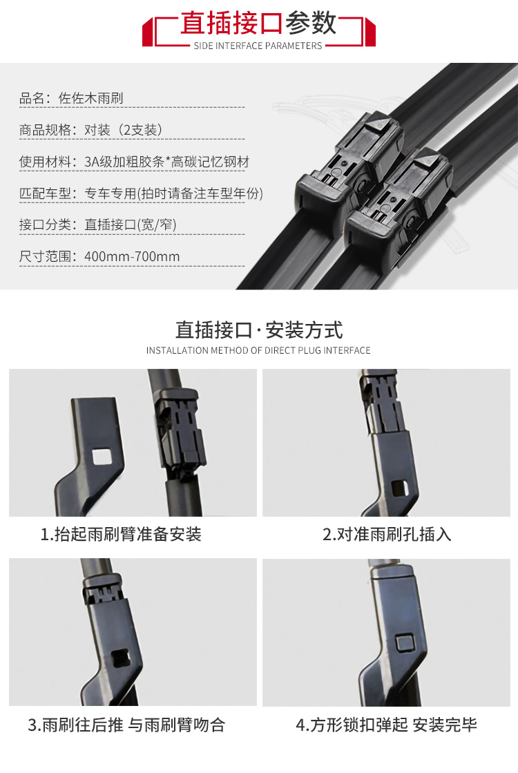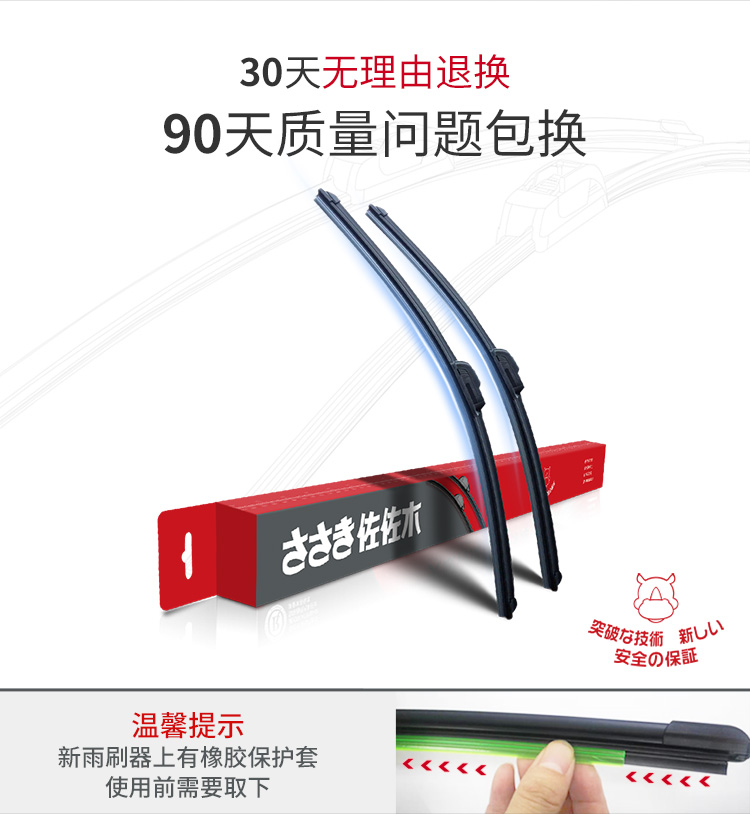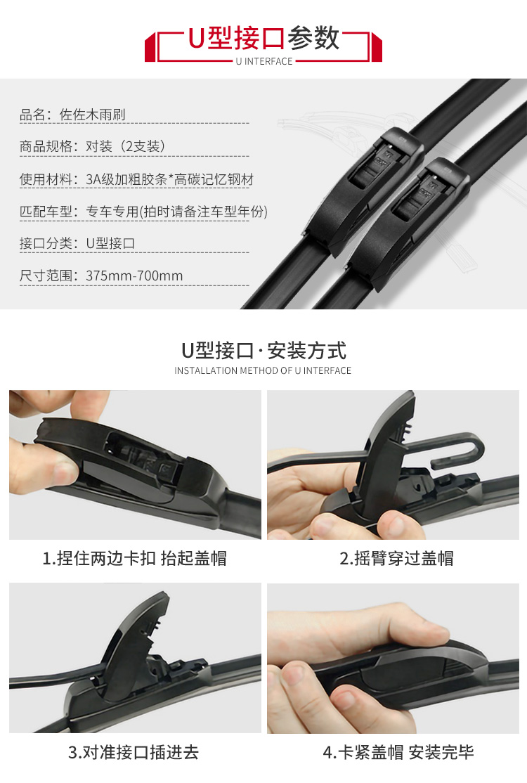 尺寸:18”,19”,16”,17”,14”,28”,27”,26”,25”,24”,23”,22”,21”,20”;销售规格:对装;架构:无骨;产品产地:国产;接口:U型通用接口;适配车窗:前窗;产品材质:橡胶;是否有防伪码:是;产品品牌:佐佐木;包装清单:前雨刷器*1对;