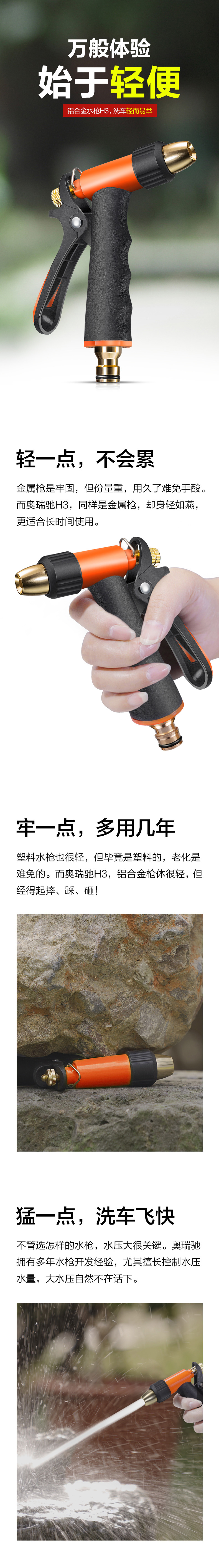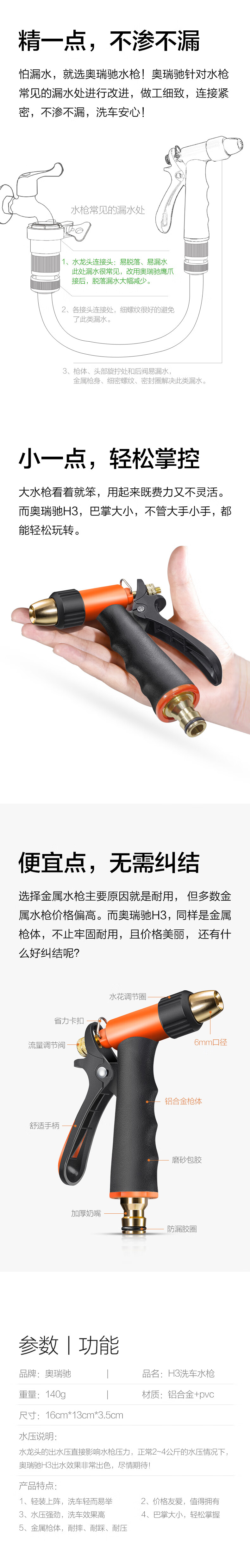 材质:合金;适用环境:汽车,摩托车,电动车,自行车,庭院,园艺,宠物,酒店,工厂,物业,牧场;水管类型:PVC软管;喷头水花类型:花洒,扇形,雾状,水柱;接口材质:铝合金;喷头材质:铝合金;手柄类型:掌压式;水管长度:11~20m;品牌:奥瑞驰;包装清单:洗车水枪 x 1、接头 x 4、生料带 x 1、15米水带 x 1;;