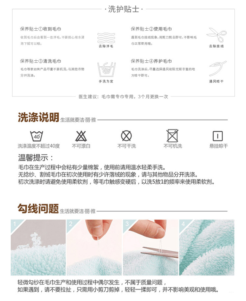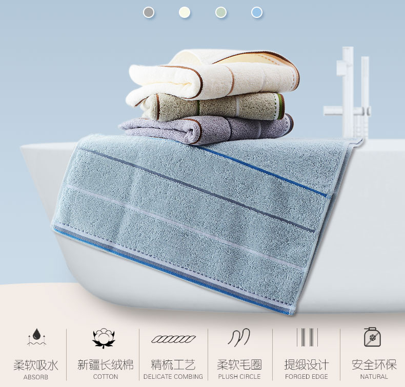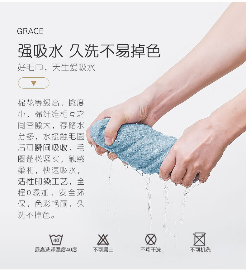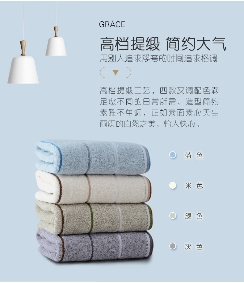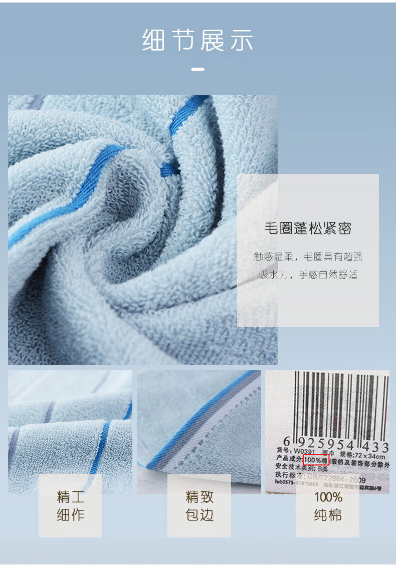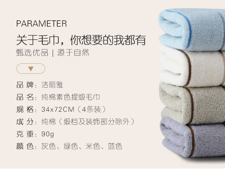 风格:简约;特点:不脱毛,持久不掉色,超强吸水,强去污力;材质:棉;类别:毛巾;工艺:毛圈;产品重量[*克(g)/件]:90g;材质:纯棉;产品规格(长x宽cm):72*34cm;包装清单:毛巾*4;
