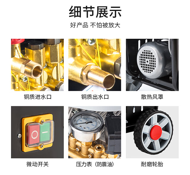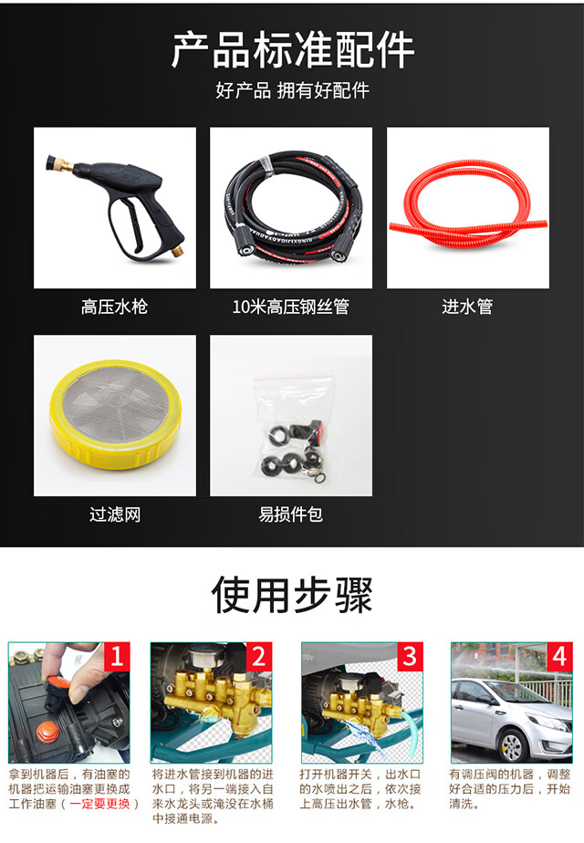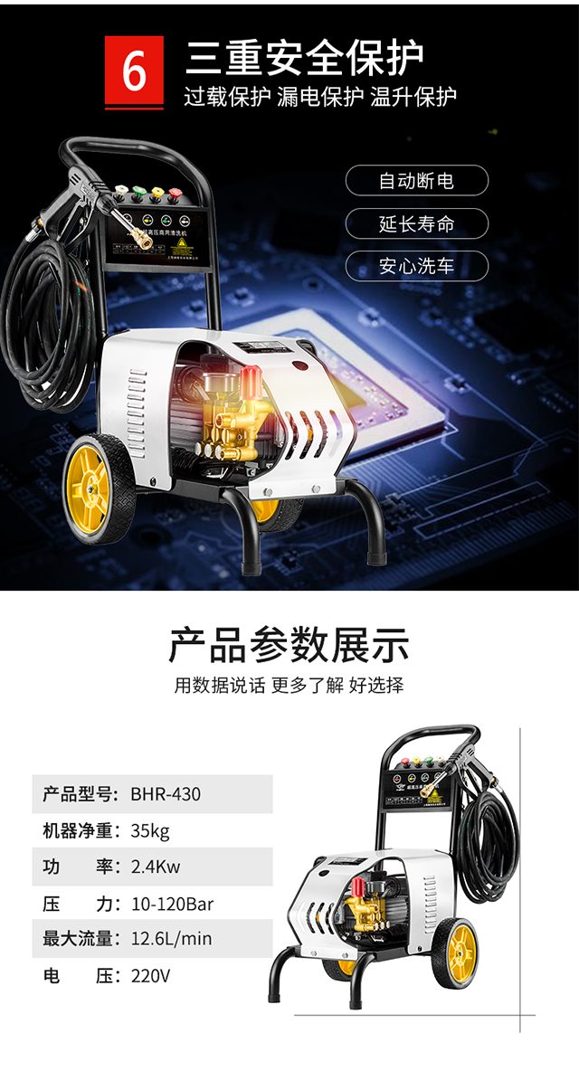 水源类型:自吸;电机冷却:风冷;适用环境:汽车,摩托车,电动车,自行车,庭院,园艺,宠物,酒店,工厂,物业,牧场,生鲜,市政;用途类型:商用高压;电源类型:220V;外观类型:推车式;额定压力:111bar以上;水管长度:10~20m;电机类型:感应电机;产品品牌:博赫尔;产品型号:430;包装清单:主机一台,进水管一根,出水管2根,水枪一把,泡沫壶一个说明书一本。;