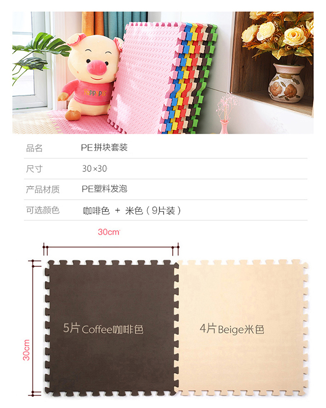 材质:其它;工艺:其它;风格:其它;适用场景:其它,商用,飘窗,儿童房,客厅,玄关,卧室,厨房,楼梯;类别:玄关垫,防滑垫,爬行垫;图案:其它;形状:其它;尺寸:30*30cm;清洁方式:其它;功能:防水;防滑;拼接;包装清单:爬行垫30*30*1.2cm(咖米9片装);