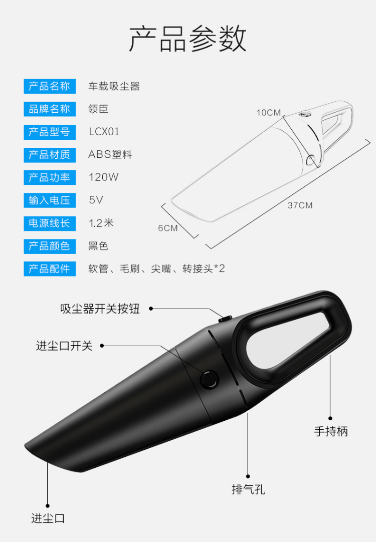 产品类型:手持式;附加功能:吸尘,吸水;使用场景:车用,地板,床,厨房,地毯,沙发,椅子,家用,干式,干湿两用;噪音:70分贝以下;线长:无线;使用范围:车家两用;吸力大小:3500pa;功率:100W以上;产品型号:LCX01;包装清单:吸尘器*1,;