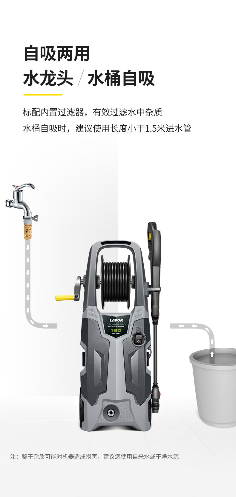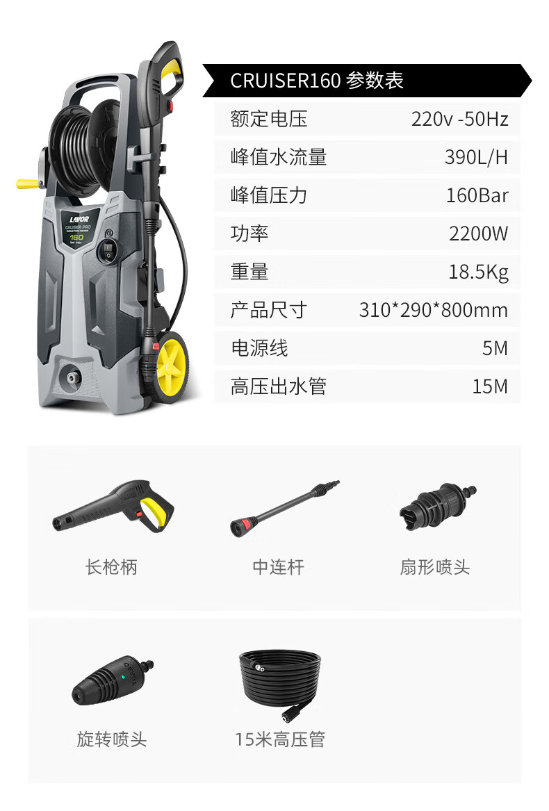 水源类型:水龙头,自吸;电机冷却:风冷;适用环境:市政,园艺,庭院,自行车,牧场,物业,工厂,酒店,摩托车,电动车,汽车;用途类型:家用高压;电源类型:220V;外观类型:推车式;额定压力:111bar以上;水管长度:10~20m;电机类型:感应电机;产品品牌:LAVOR;产品型号:CRUISER160;包装清单:1.5米自吸管*1,枪柄*1,中连杆*1,旋转喷头*1,扇形喷头*1, 15米高压管*1,4分奶嘴*1,6分奶嘴*1,快速接头*2;