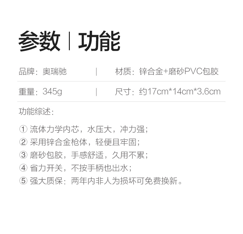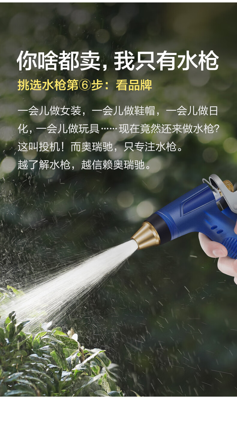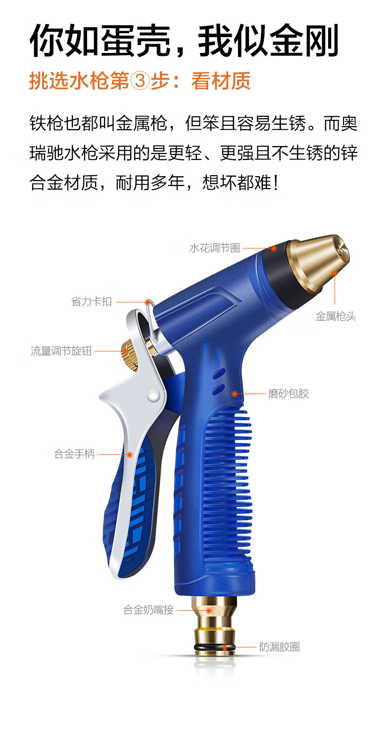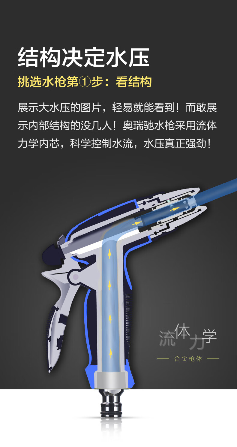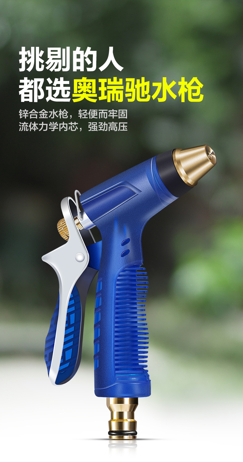 材质:合金;适用环境:自行车,庭院,园艺,宠物,汽车,摩托车,电动车,酒店,工厂,物业,牧场;水管类型:PVC软管;喷头水花类型:花洒,水柱;接口材质:铜;喷头材质:铜;手柄类型:掌压式;水管长度:11~20m;品牌:奥瑞驰;包装清单:洗车水枪 x 1、接头 x 5、生料带 x 1、20米水带 x 1;;