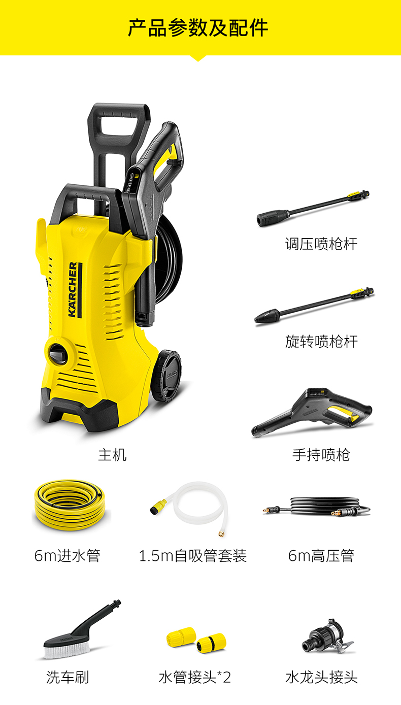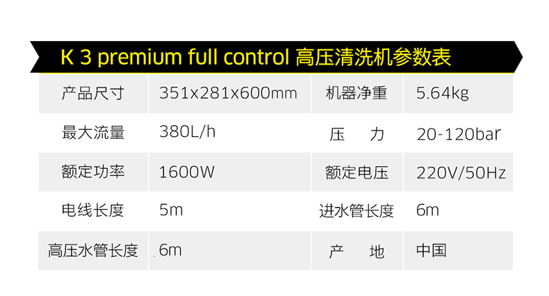 水源类型:水龙头,自吸;电机冷却:风冷;适用环境:市政,生鲜,宠物,园艺,庭院,自行车,牧场,物业,工厂,酒店,摩托车,电动车,汽车;用途类型:家用高压;电源类型:220V;外观类型:立式;额定压力:111bar以上;水管长度:10m以下;电机类型:串激电机;产品品牌:卡赫;产品型号:K3Premium Full Control;包装清单:主机x1,调压喷枪杆x1,旋转喷枪杆x1,手持喷枪x1,6m进水管x1,1.5m自吸管套装x1,6m高压管x1,洗车刷x1,水管接头x2,水龙头接头x1;