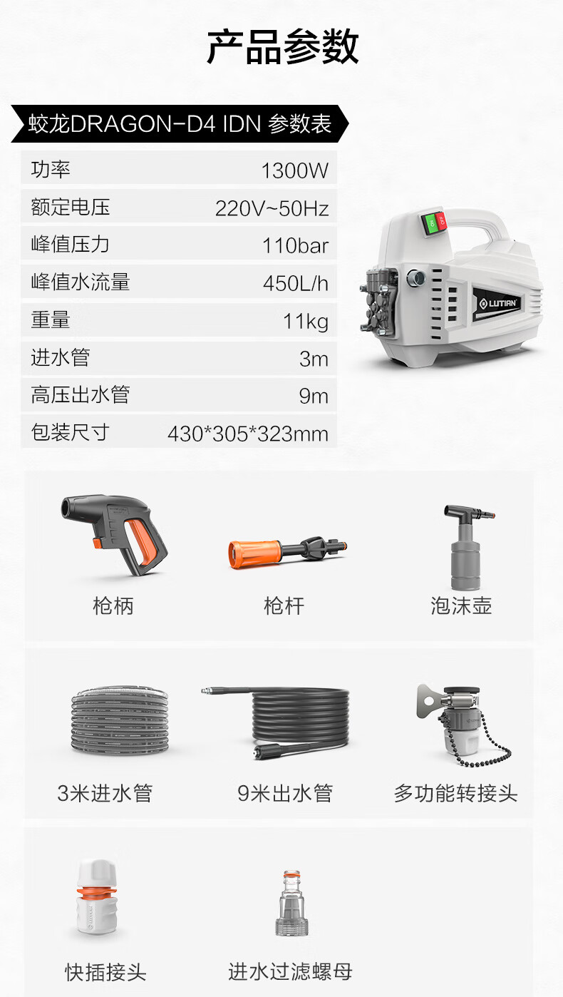 水源类型:水龙头,自吸;电机冷却:风冷;适用环境:生鲜,宠物,园艺,庭院,自行车,物业,酒店,摩托车,电动车,汽车;用途类型:家用高压;电源类型:220V;外观类型:卧式;额定压力:71~110bar;水管长度:10~20m;电机类型:感应电机;产品品牌:绿田;产品型号:蛟龙 DRAGON-D4 IDN;包装清单:主机、高压水枪、进水管、出水管、快速接头、进水过滤螺母、多功能接头、高压泡沫壶、洗车三件套(详细配置见主图配件);