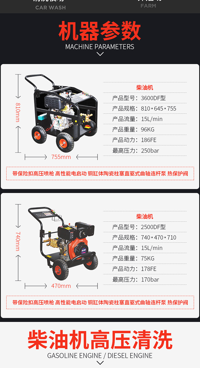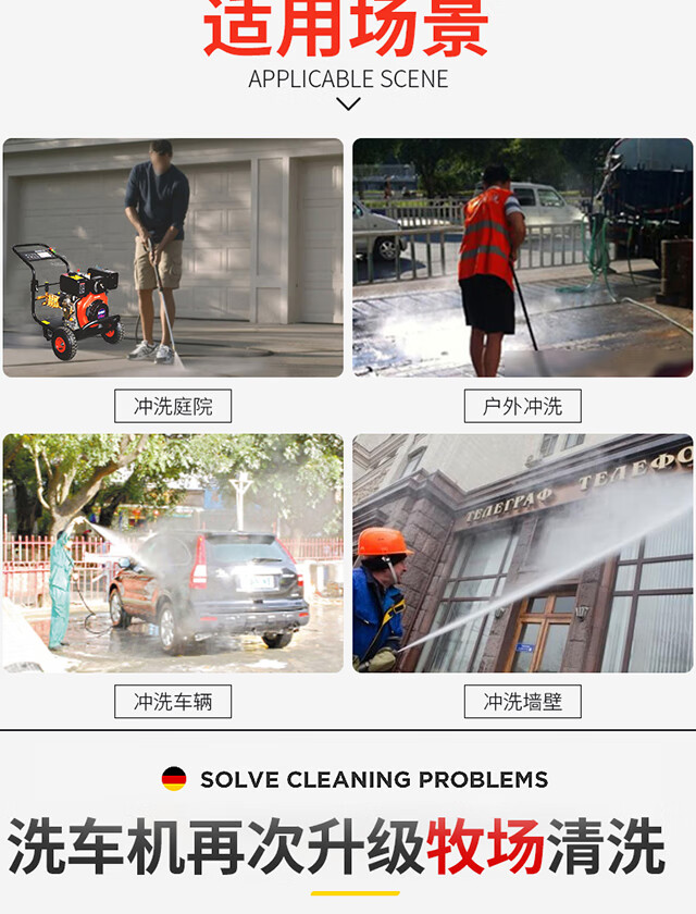水源类型:自吸;适用环境:汽车,摩托车,电动车,自行车,庭院,园艺,宠物,酒店,工厂,物业,牧场,生鲜,市政;用途类型:商用高压;电源类型:其他;外观类型:推车式;额定压力:111bar以上;水管长度:10~20m;产品品牌:博赫尔;产品型号:3600DF型柴油机;包装清单:主机一台,进水管一根,出水管一根,水枪一把,说明书一本;