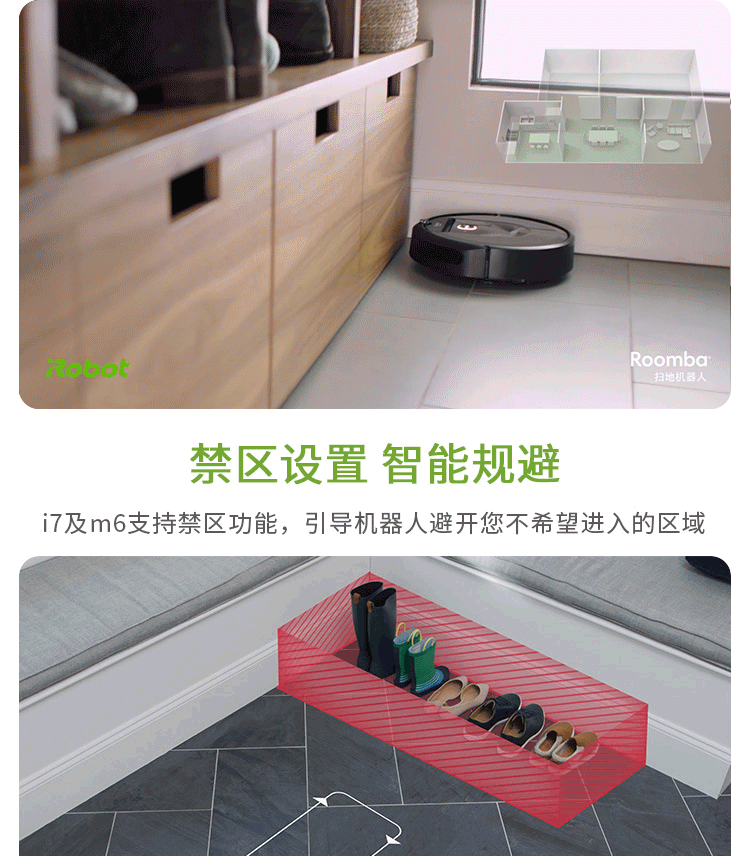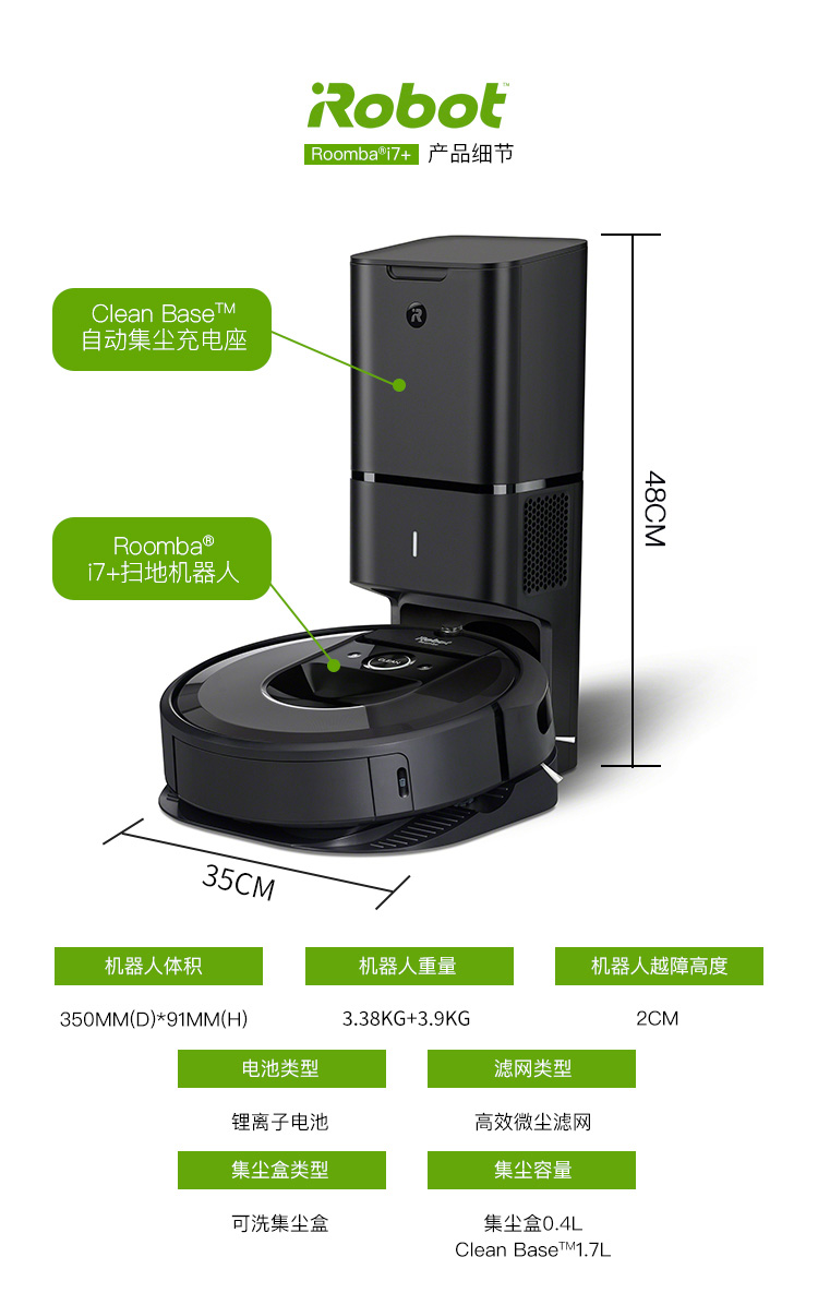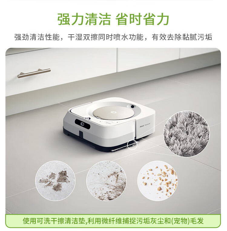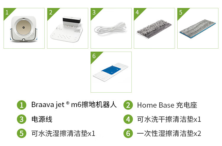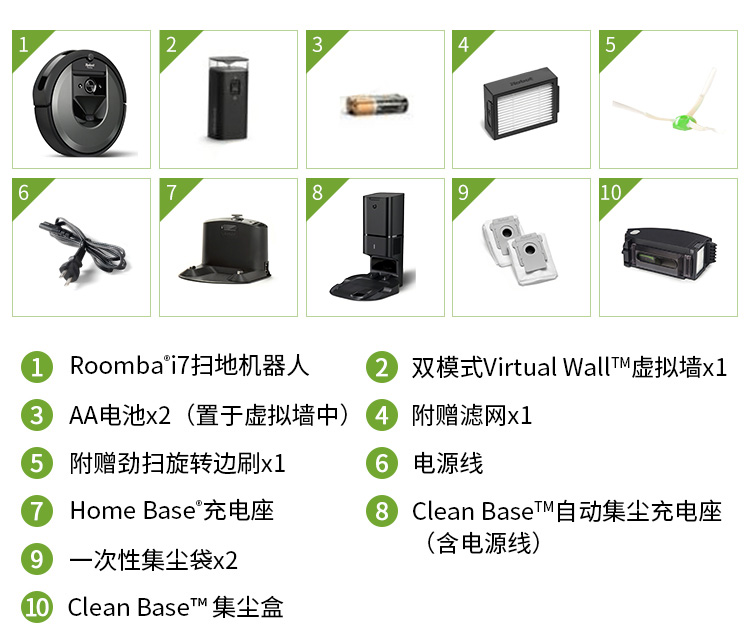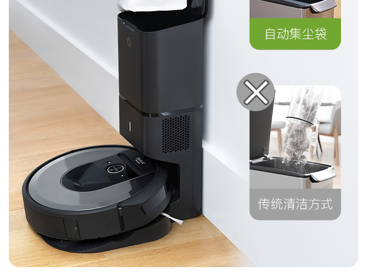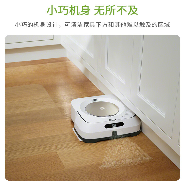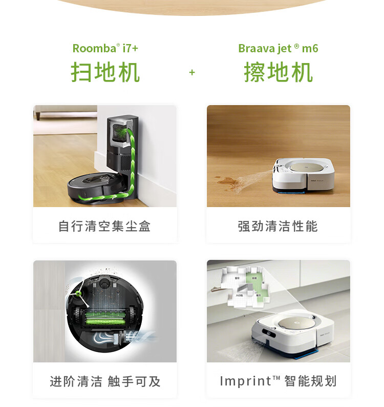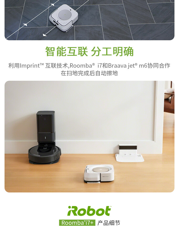 产品类型:扫擦套装;虚拟墙类型:硬件虚拟墙;防撞类型:机械撞板;电池类型:锂电池;特色功能:APP控制,自动清扫模式,灰尘识别感应器,定时预约,拖地功能;清洁类型:滚刷吸口互换;电池节数:6节;机身高度:9-10cm;电池容量:1999mAH以下;适用面积:120平以上;水箱容量:250毫升以上;规划技术:单目视觉规划;拖地/水箱类型:电控水箱;电机类型:无刷电机;续航时间:121分钟-180分钟;清扫路线:规划式;机身高度(cm):10cm;电池节数(节):8节;吸力(pa/aw):0pa/aw;噪音(db):60db;充电类型:自动回充;充电时间:约2H;续航时间(分钟):120分钟;品牌:iRobot;产品型号:Braava jet m6+Roomba i7+;产品尺寸(mm):429 x 145 x 540;额定功率(W):33W;水箱容量(L):0.45L;额定电压(V):220V;产品净重(kg):5.9kg;包装清单:i7扫地机器人*1、 Home Base充电座*1、电源线*1、虚拟墙 *1、滤网*1、边刷*1、clean base自动集尘充电座*1、电源线*1尘盒*1 、一次性集尘袋*2、m6擦地机器人*1、一次性湿擦清洁垫*2、可水洗干擦清洁垫*1、可水洗湿擦清洁垫*1、滴水盘*1、回充充电底座*1、电池*1、clean base 垃圾袋*3、iRobot 定制U盘*1、清洁垫*2、i7配件套装(边刷 *;